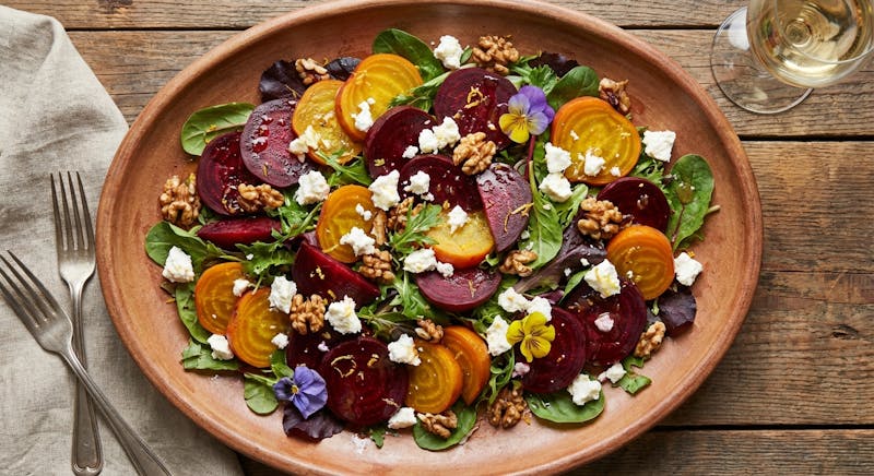 This earthy beet salad features roasted beets, toasted walnuts, fresh greens, and goat cheese with a simple balsamic vinaigrette. Includes vegan and vegetarian options.